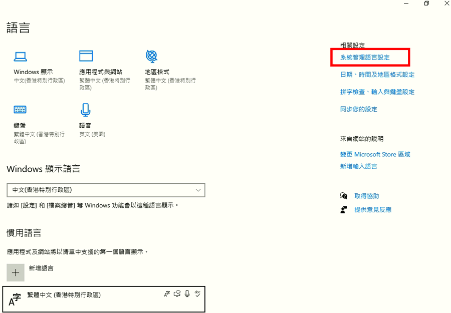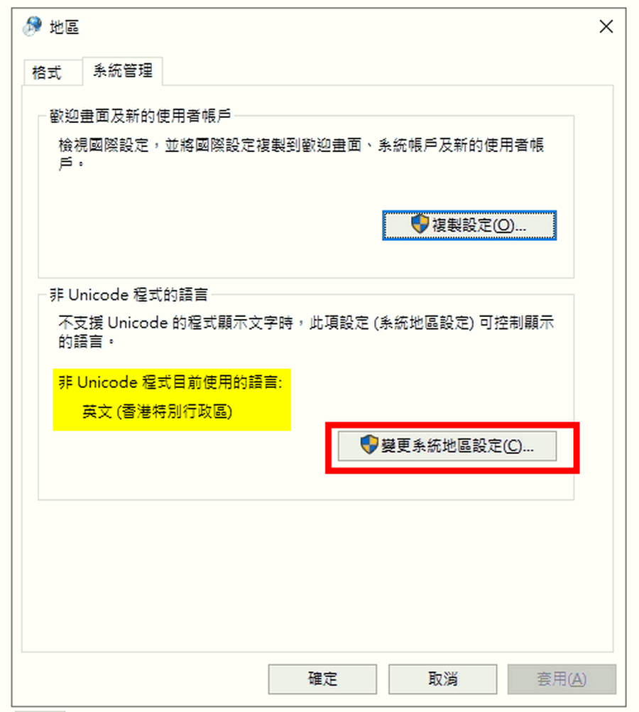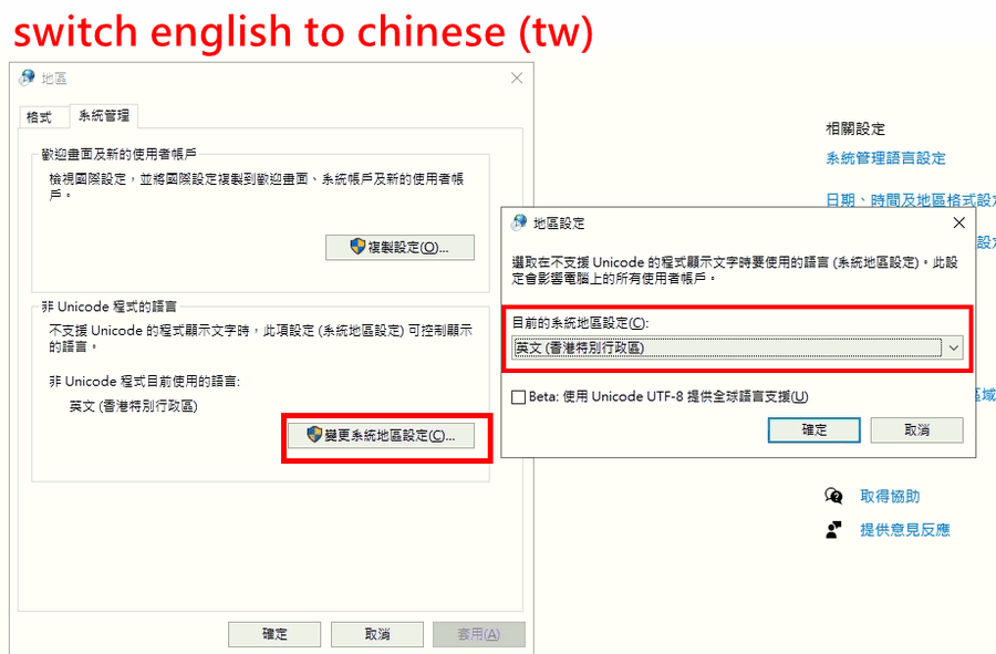 3.把原本設定英文修改, 點擊變更系統地區設定;