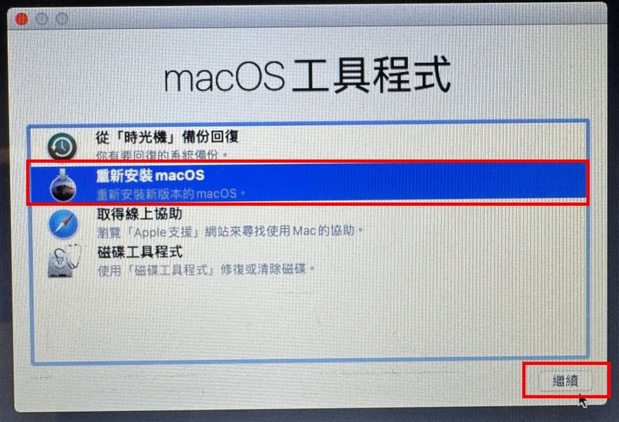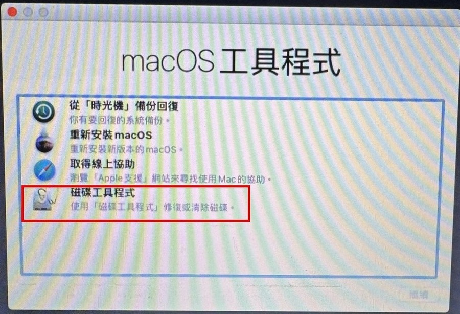 14.在macOS工具程式, 選擇磁碟, 點擊繼續;