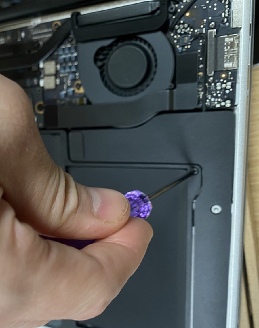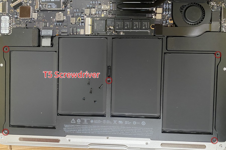 6.使用 T5 批頭, 拆除固定A1466電池的螺絲;