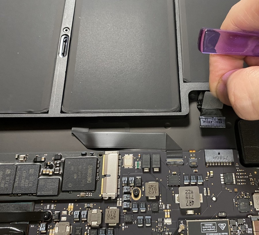 8.斷開電池供電,移走A1466電池介面有小膠片, 慢慢升上移;