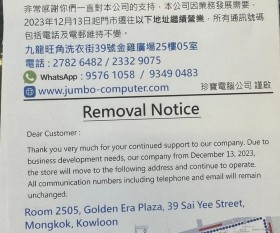 Jumbo Computer Supplies 搬遷啟示 尊敬的客戶:非常感謝你們一直對本公司的支持,本公司因業務發展需要,2023年12月13日起門市遷往以下地址繼續營業,所有通訊號碼,包括電話及...